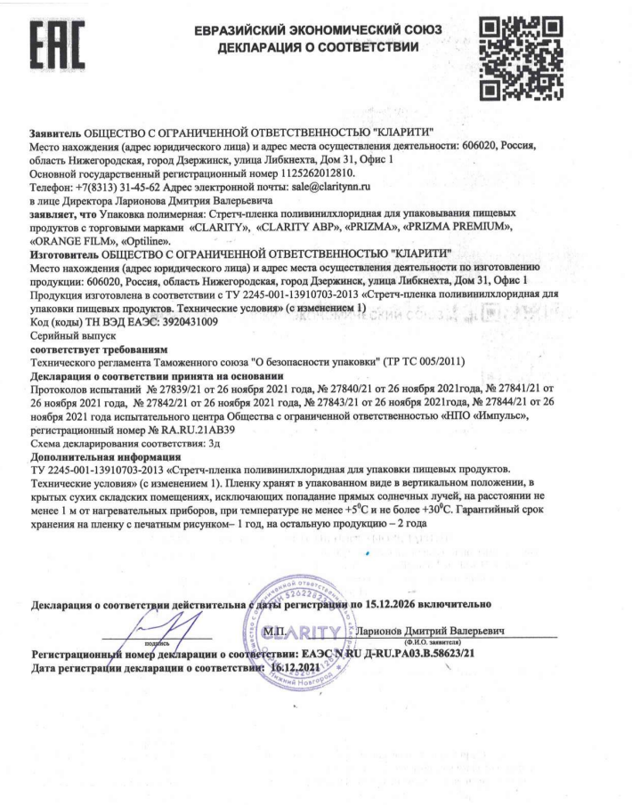 Пищевая ПВХ-пленка "Clarity" шириной 30 см и толщиной 8 микрон (А1) – это универсальный упаковочный материал, который найдет применение в кафе, ресторанах, столовых и прочих заведениях сегмента HoReCa. Она обеспечивает надежную защиту продуктов от внешнего воздействия, помогая сохранить свежесть и привлекательный внешний вид готовых блюд и полуфабрикатов. Материал устойчив к жирам и влаге. Пленка "Clarity" соответствует всем санитарно-гигиеническим нормам и подходит для прямого контакта с пищей.